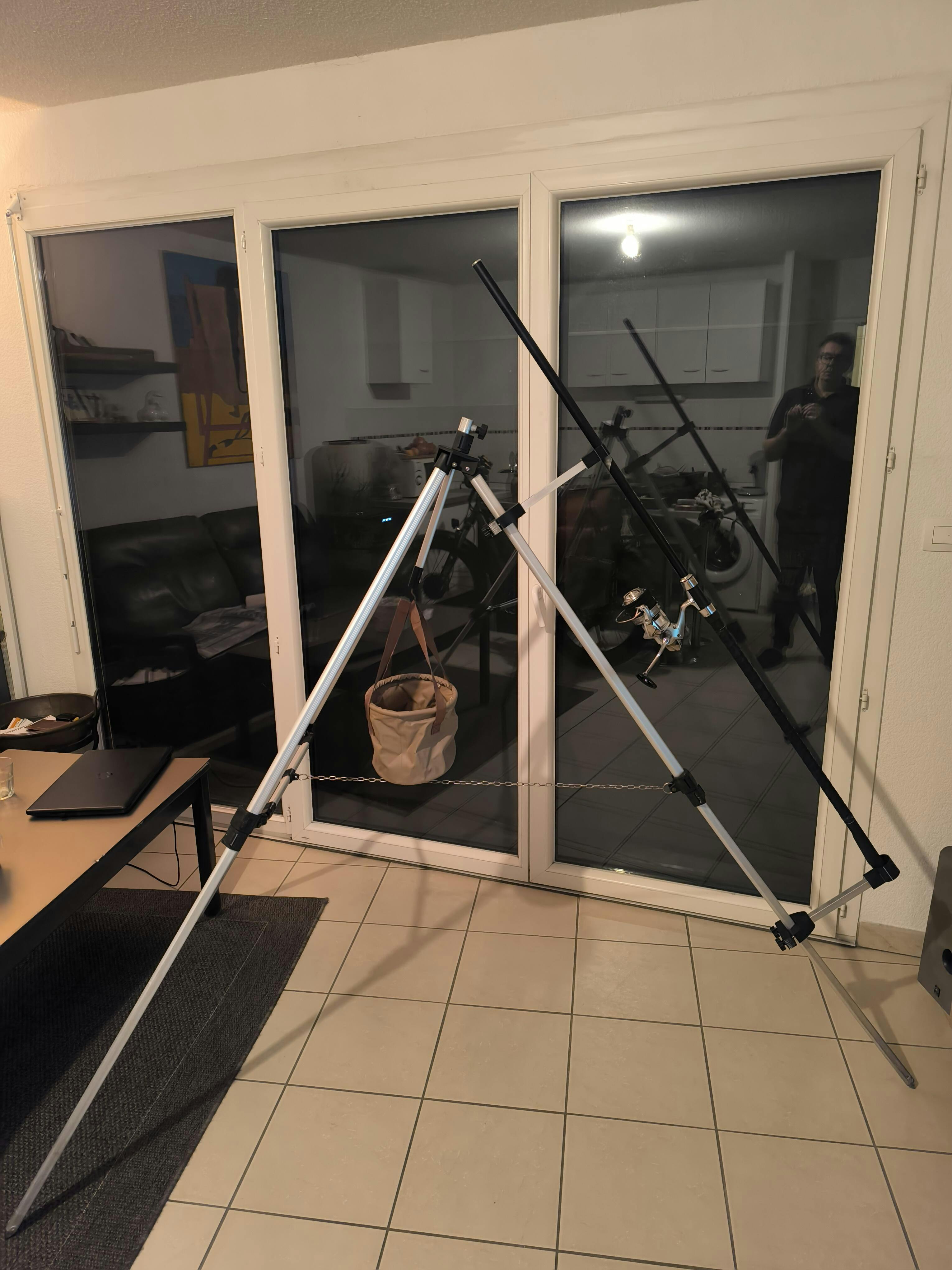 Grâce à ses manchons en aluminium ajustés sur mesure, la canne est réhaussée afin de rester totalement libre sur le trépied :